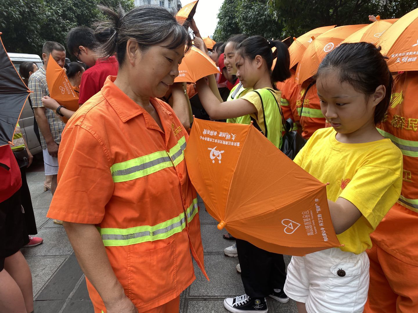 在为参与活动的环卫工人赠送爱心伞后,江津阳光志愿者们分组去往不同的地点,为正在辛勤劳作的环卫工人们送爱心伞,感谢环卫工人日复一日的辛勤劳动和对创建卫生城市做出的巨大贡献,收获了环卫工人们的笑脸。孩子家长们还自发准备了解暑饮品夏桑菊为环卫工人送去了清凉。